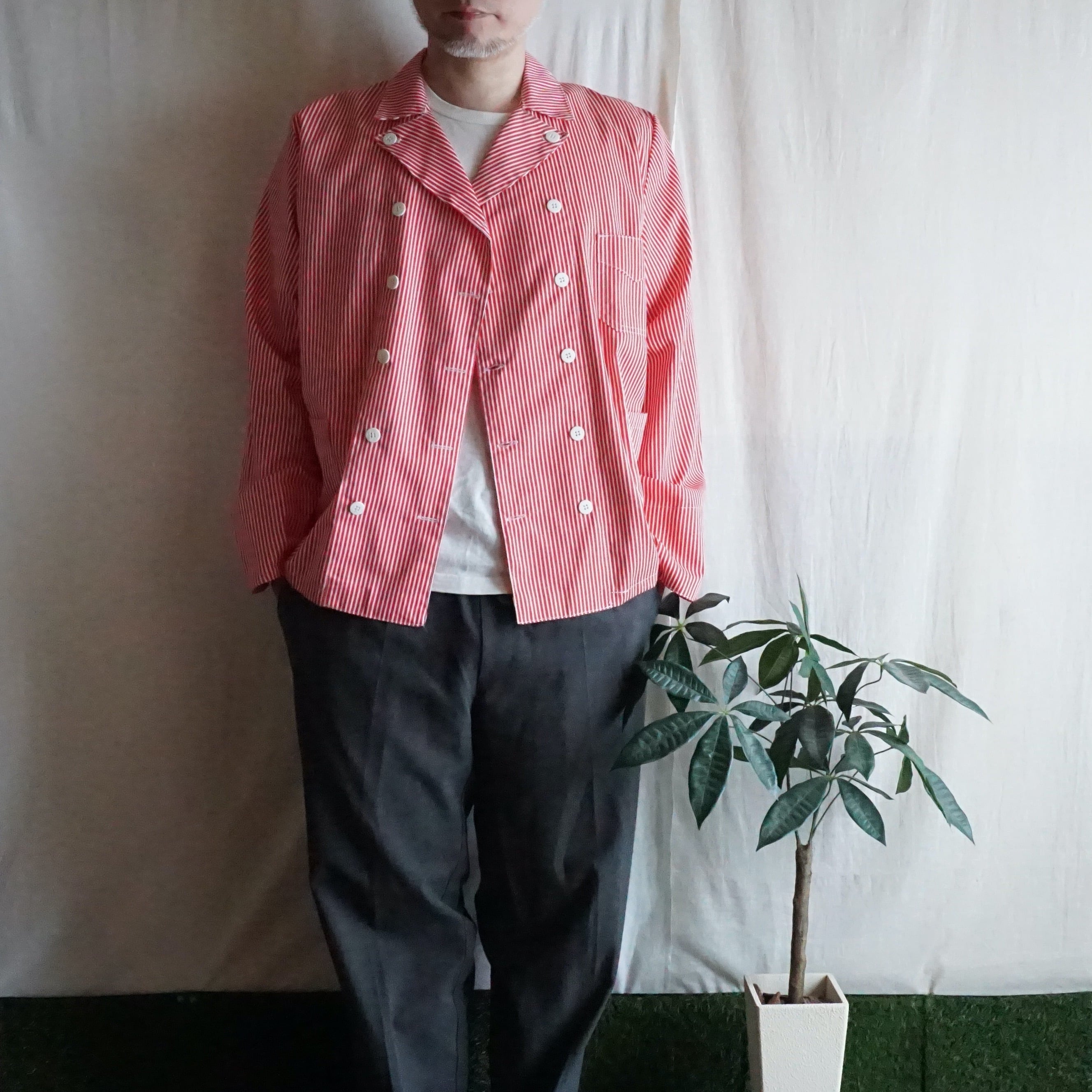 ブルーの細かい千鳥格子のチェックが主流のコックジャケットですが、本製品は赤のストライプという変わった仕様です。