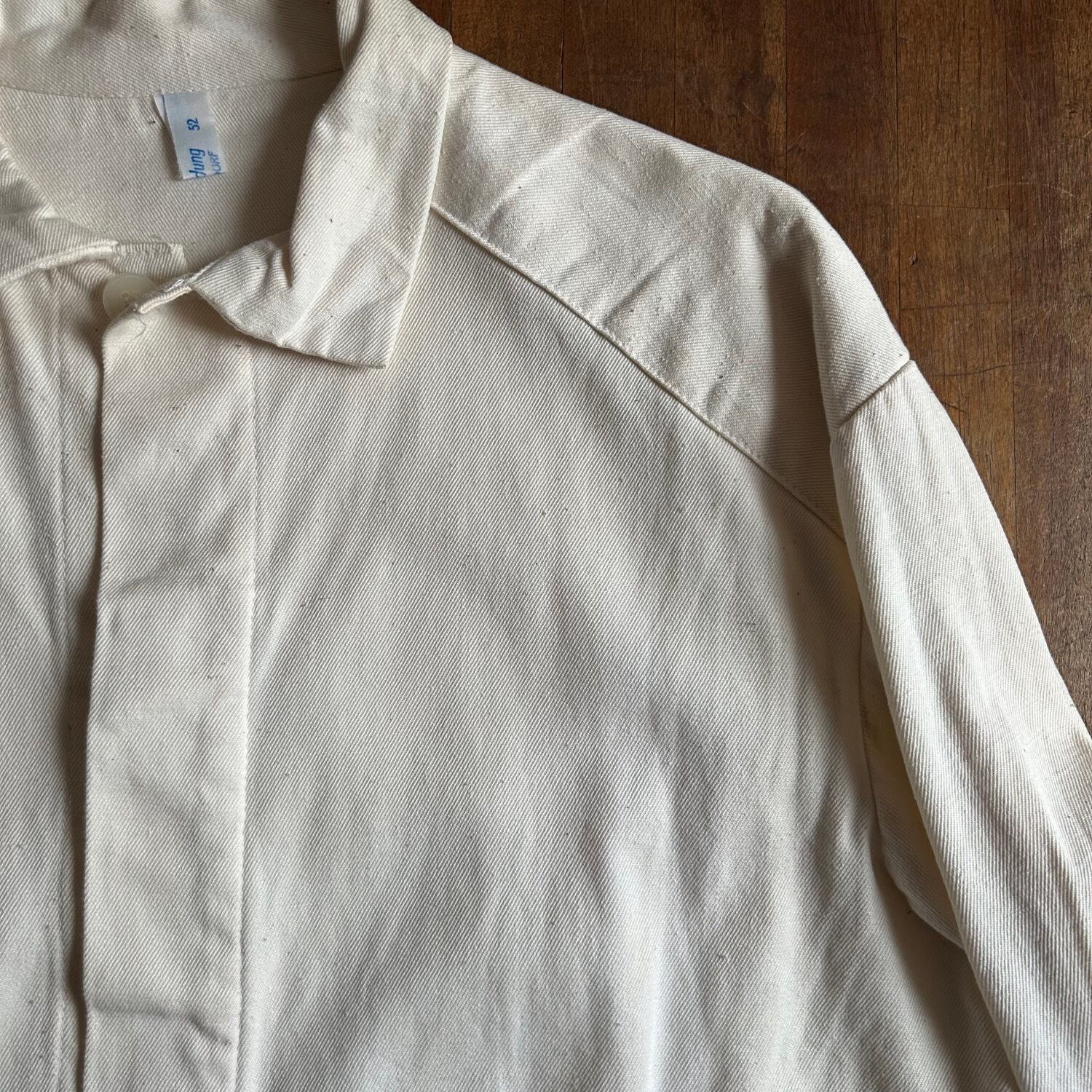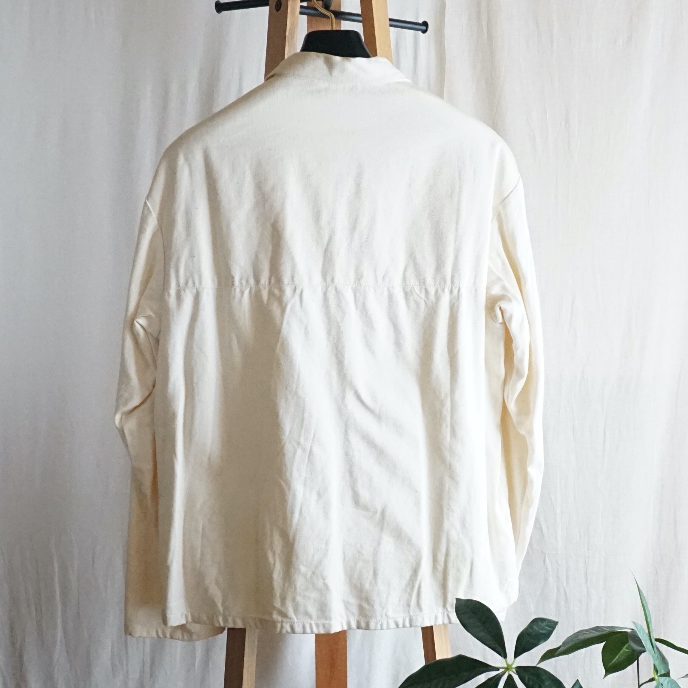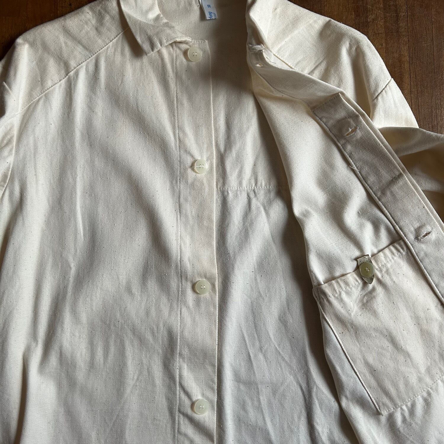 襟が小さく比翼仕立て(隠しボタン)仕様なので柔らかい上品な表情のワークジャケットです。
