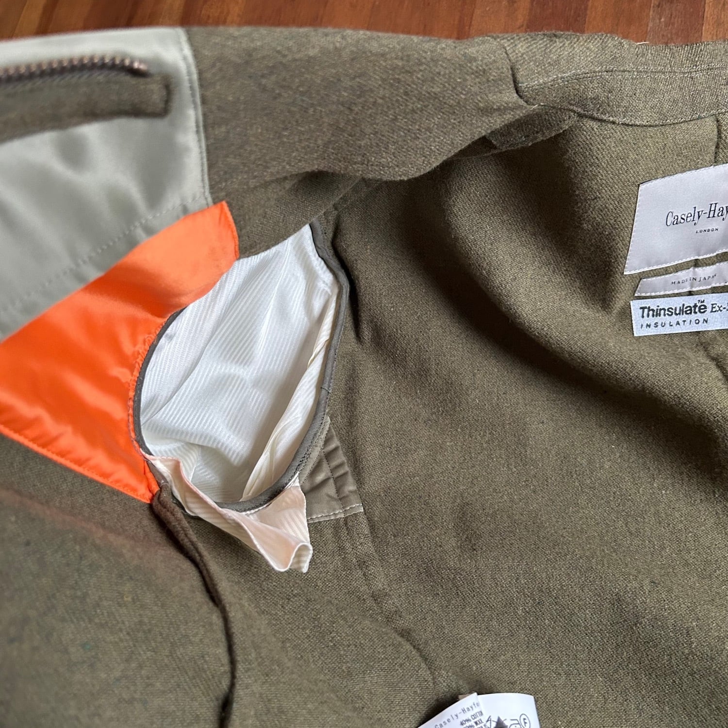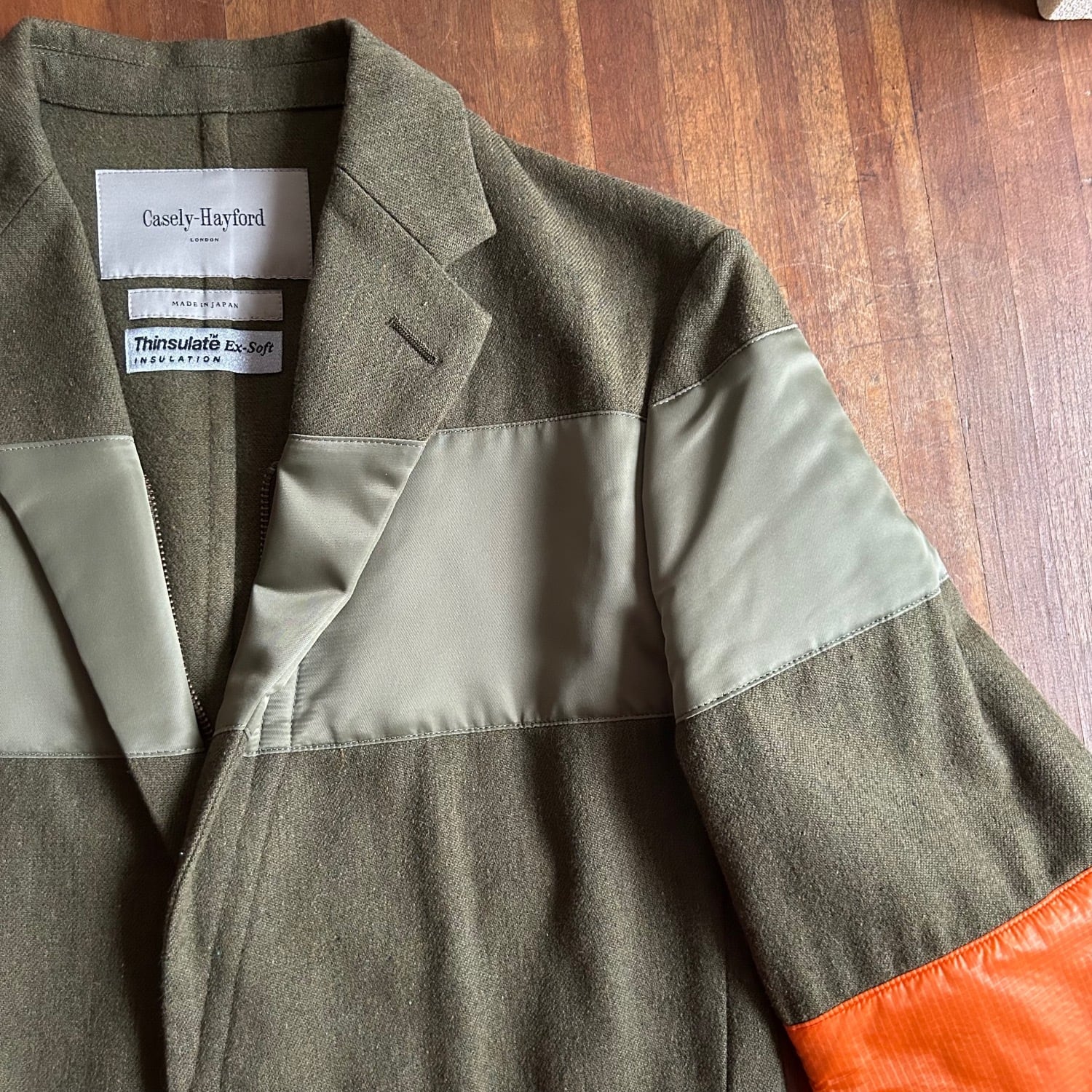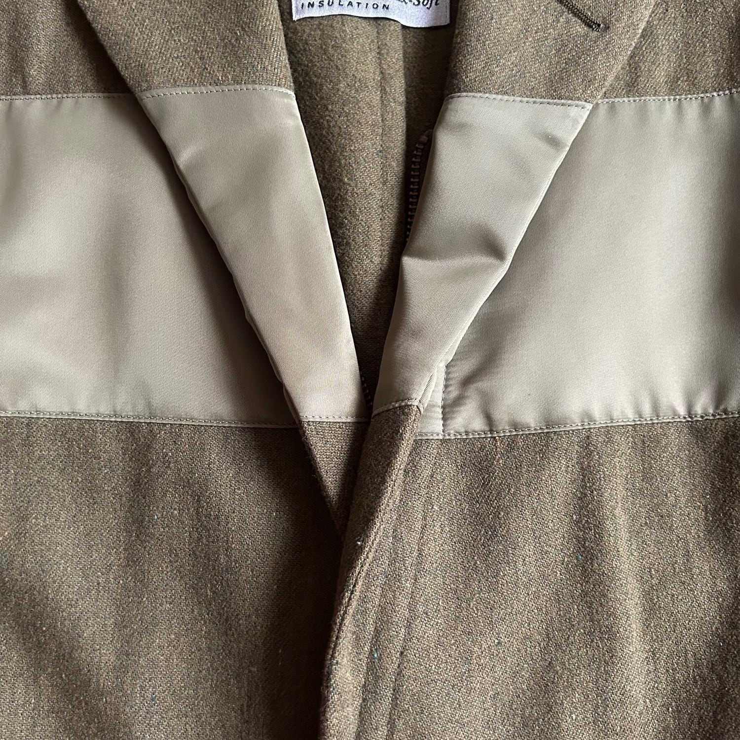 中厚手に織られたコットンウール混紡のツイード部分に胸元と同部分にそれぞれ違う素材で切替があるのが特徴です。