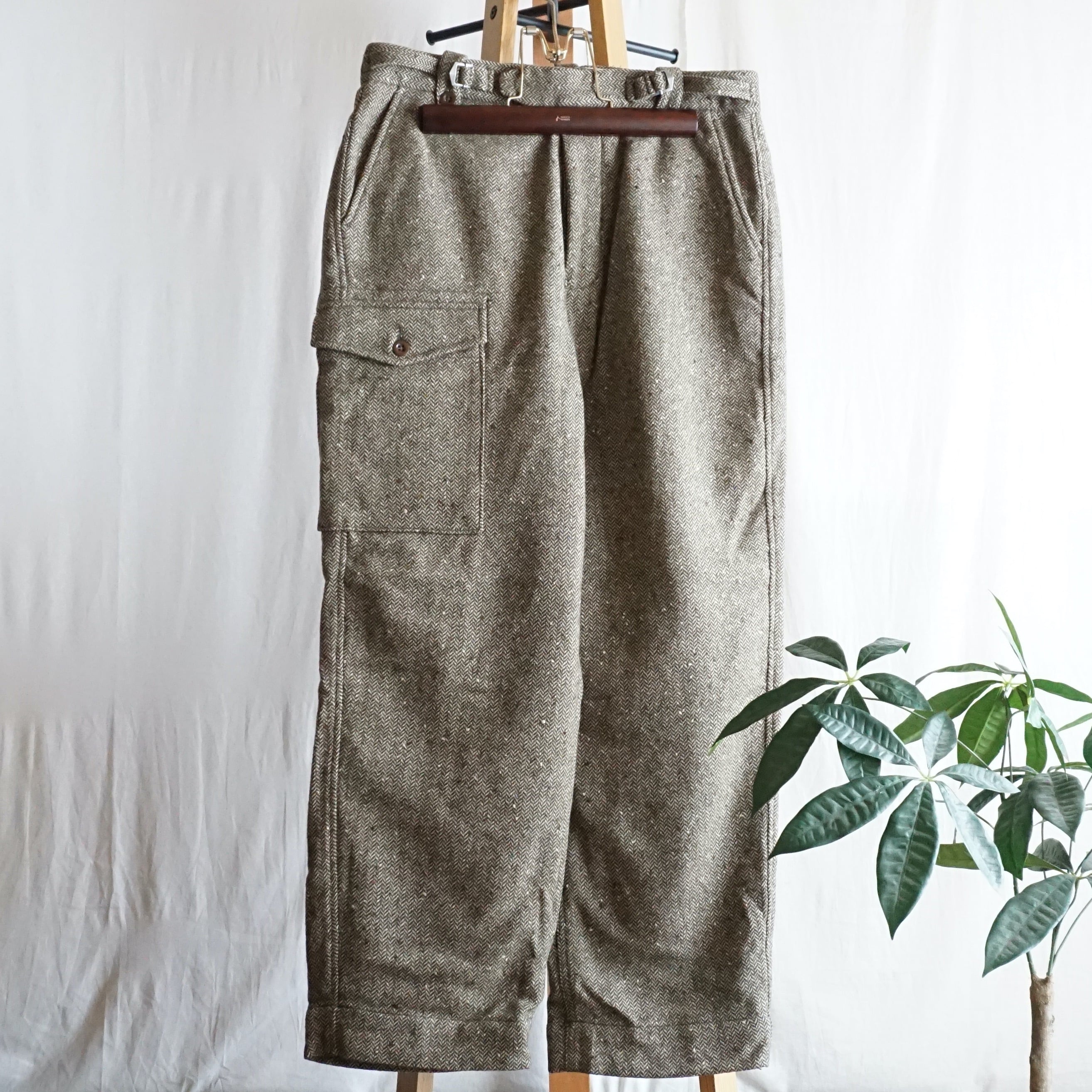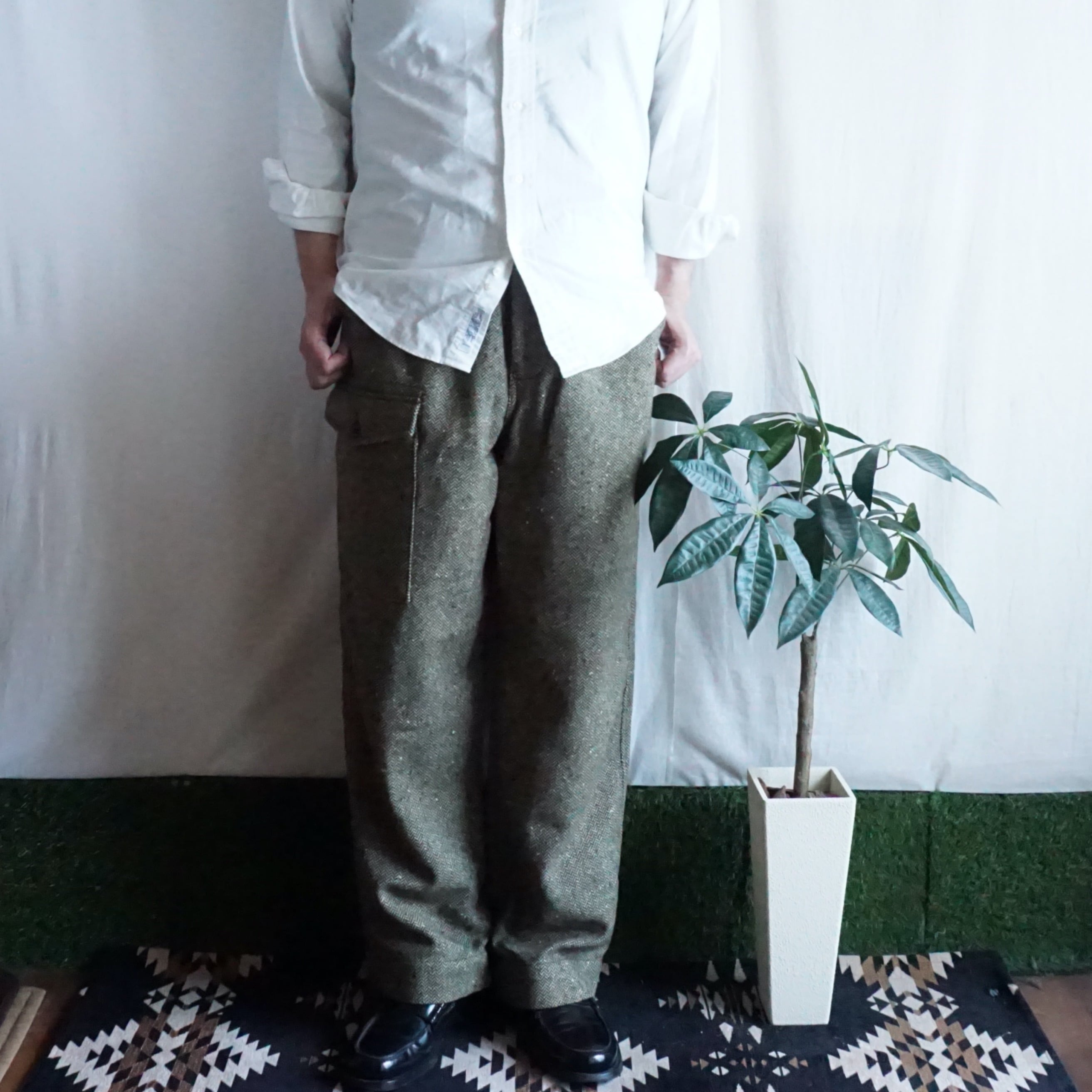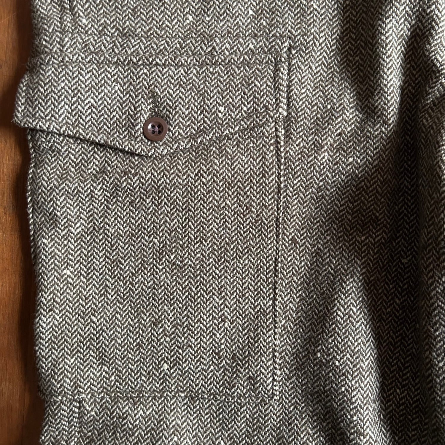ブラウンのヘリンボーンというツイードらしい無骨な見た目とヴィンテージのミリタリーから着想を得たであろう片側のサイドポケットがとても雰囲気があります。