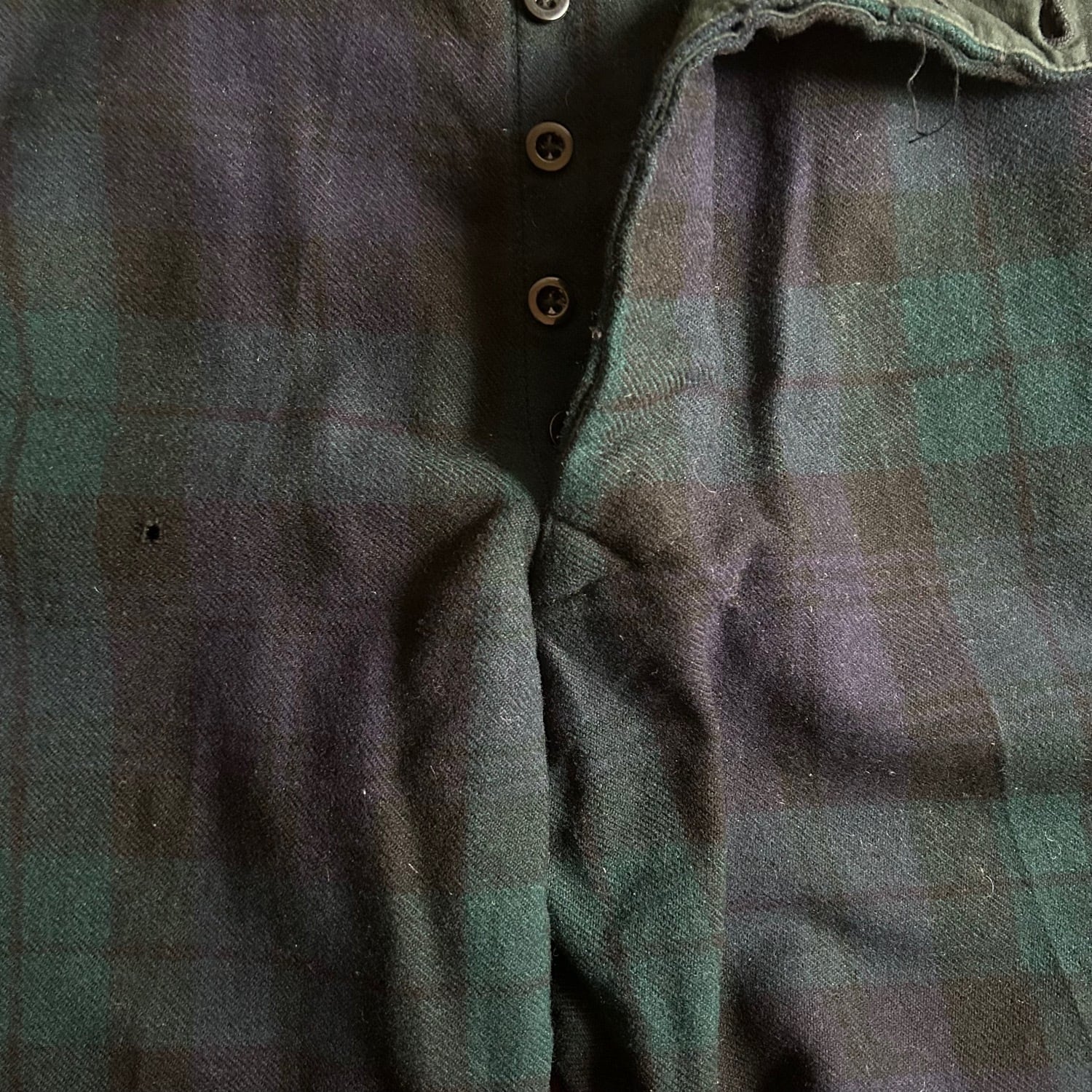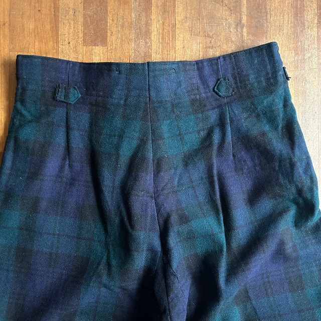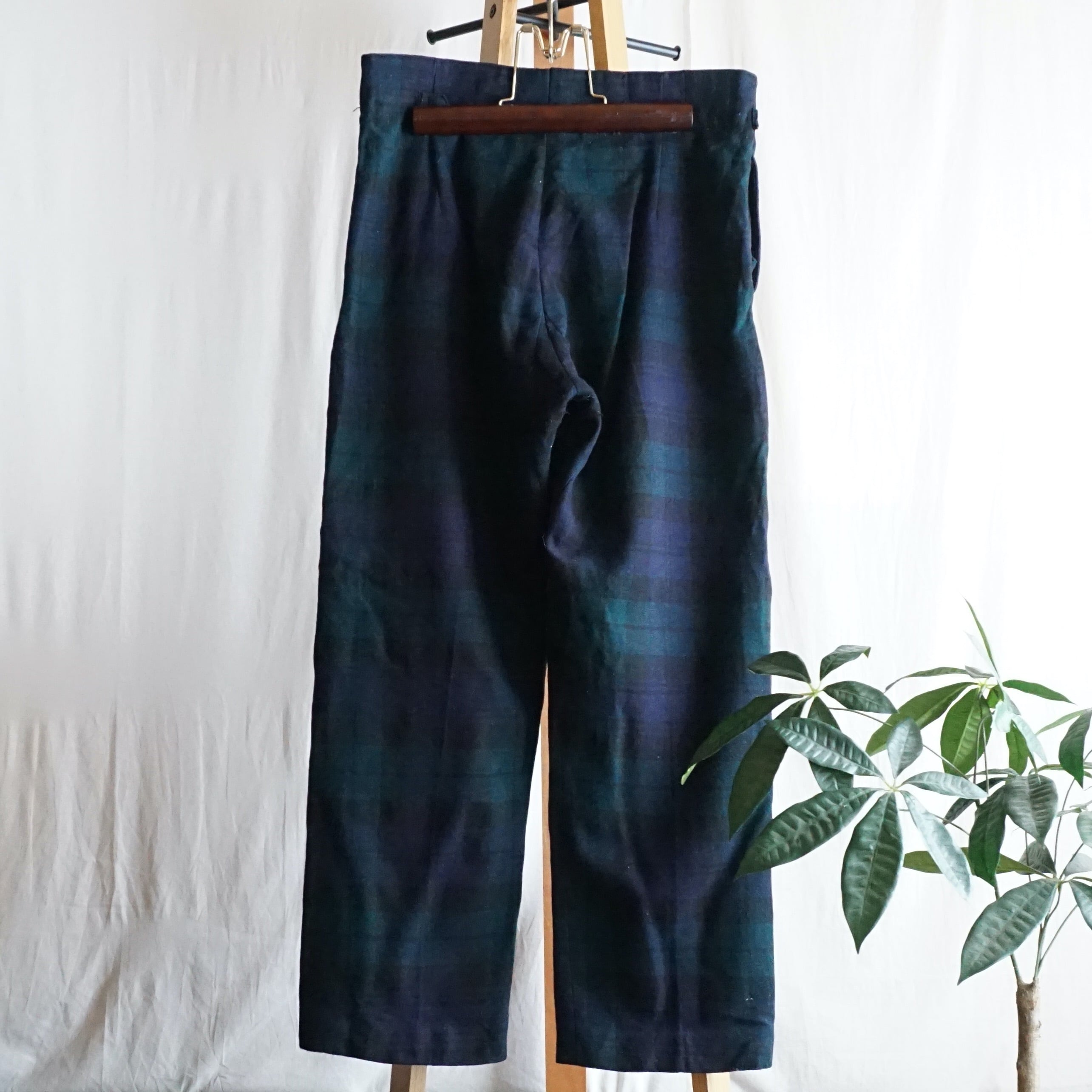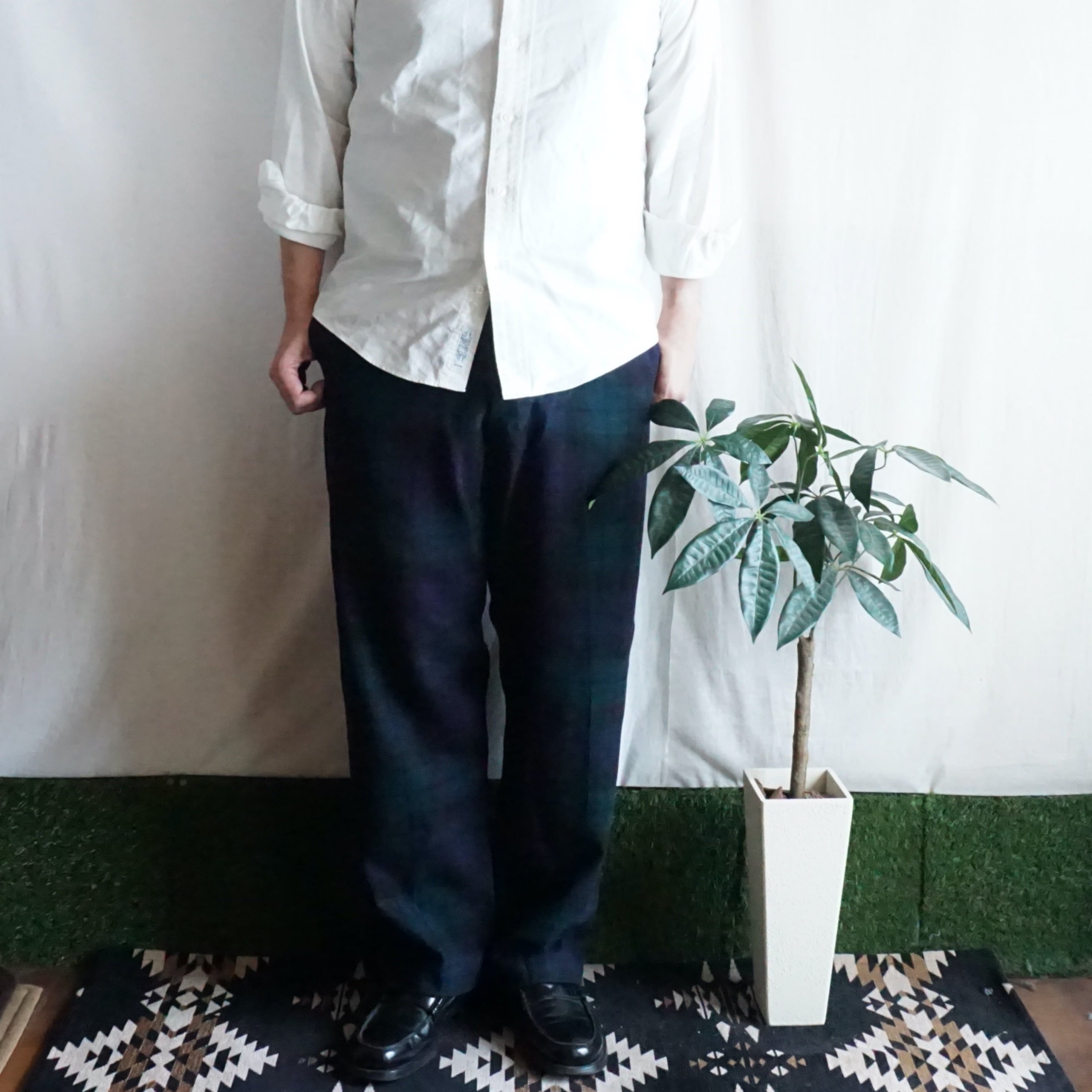 それを抜きにしても集めのウールの質感やベルトループ無しのスッキリとした腰回り、そして深い股上にワイドなシルエットとブラックウォッチの柄だけでなく魅力に溢れたパンツです。