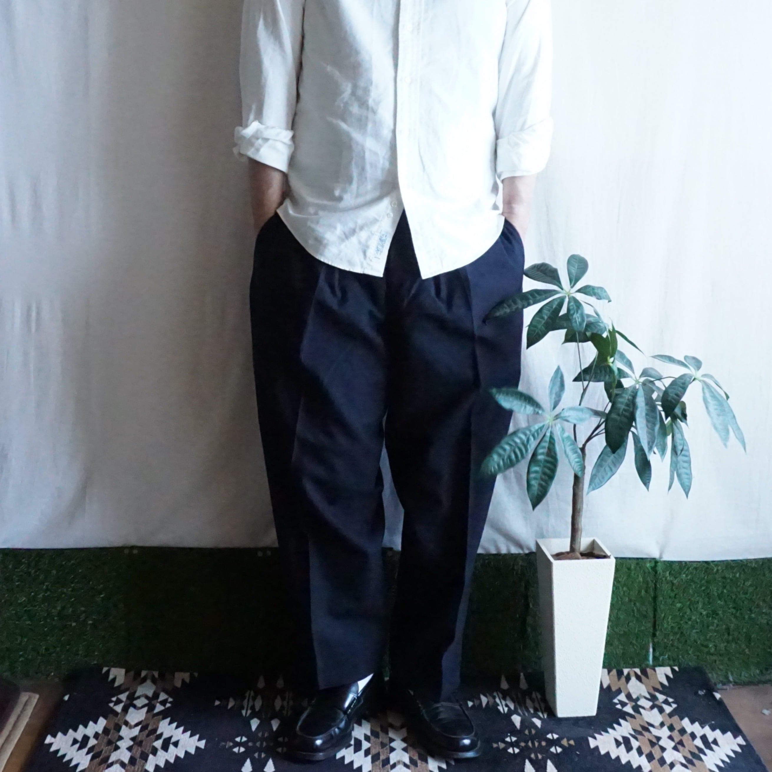 ゆったりとしたワイドパンツですが、裾に向けて極端にならないぐらいにテーパードしているのですっきりと履けます。(着画参照)