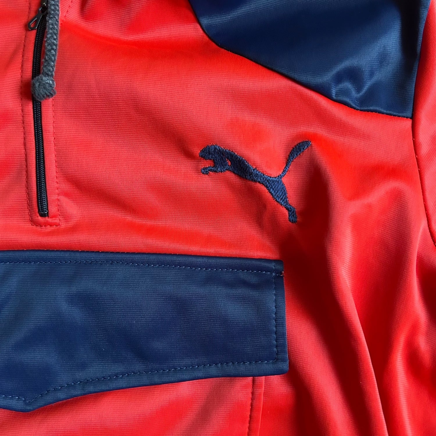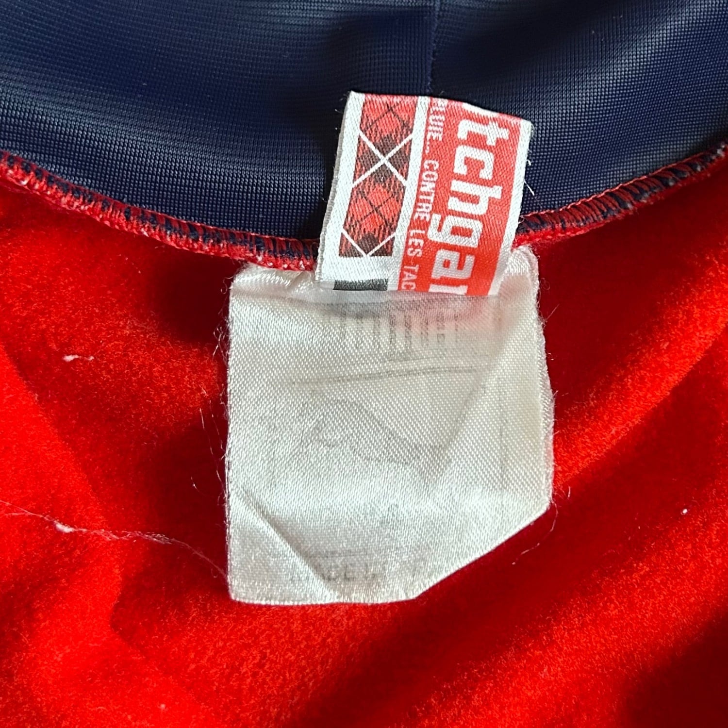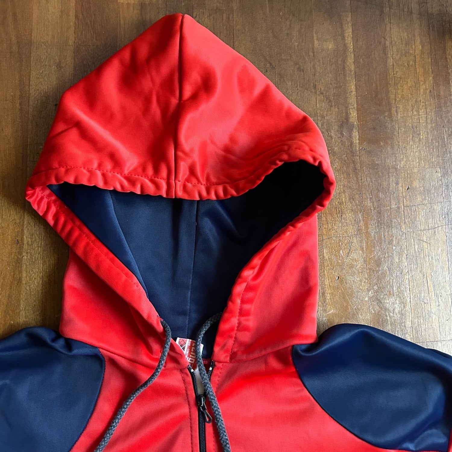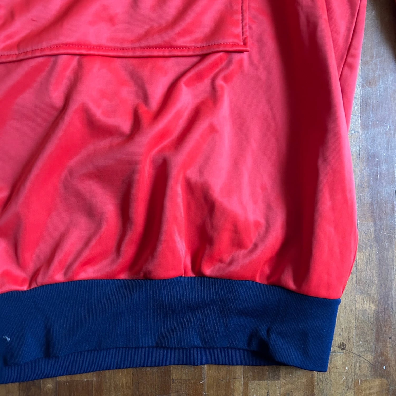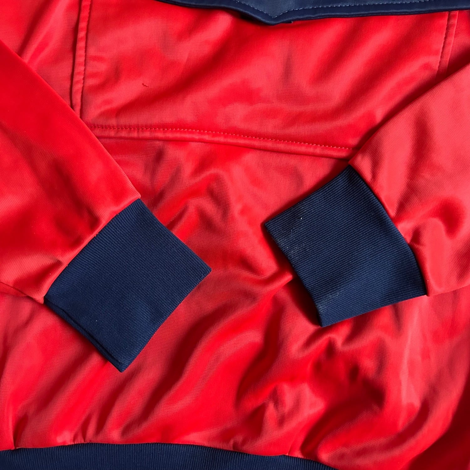 発色の良いレッドに肩や袖はネイビーのカラーの切り替えです。