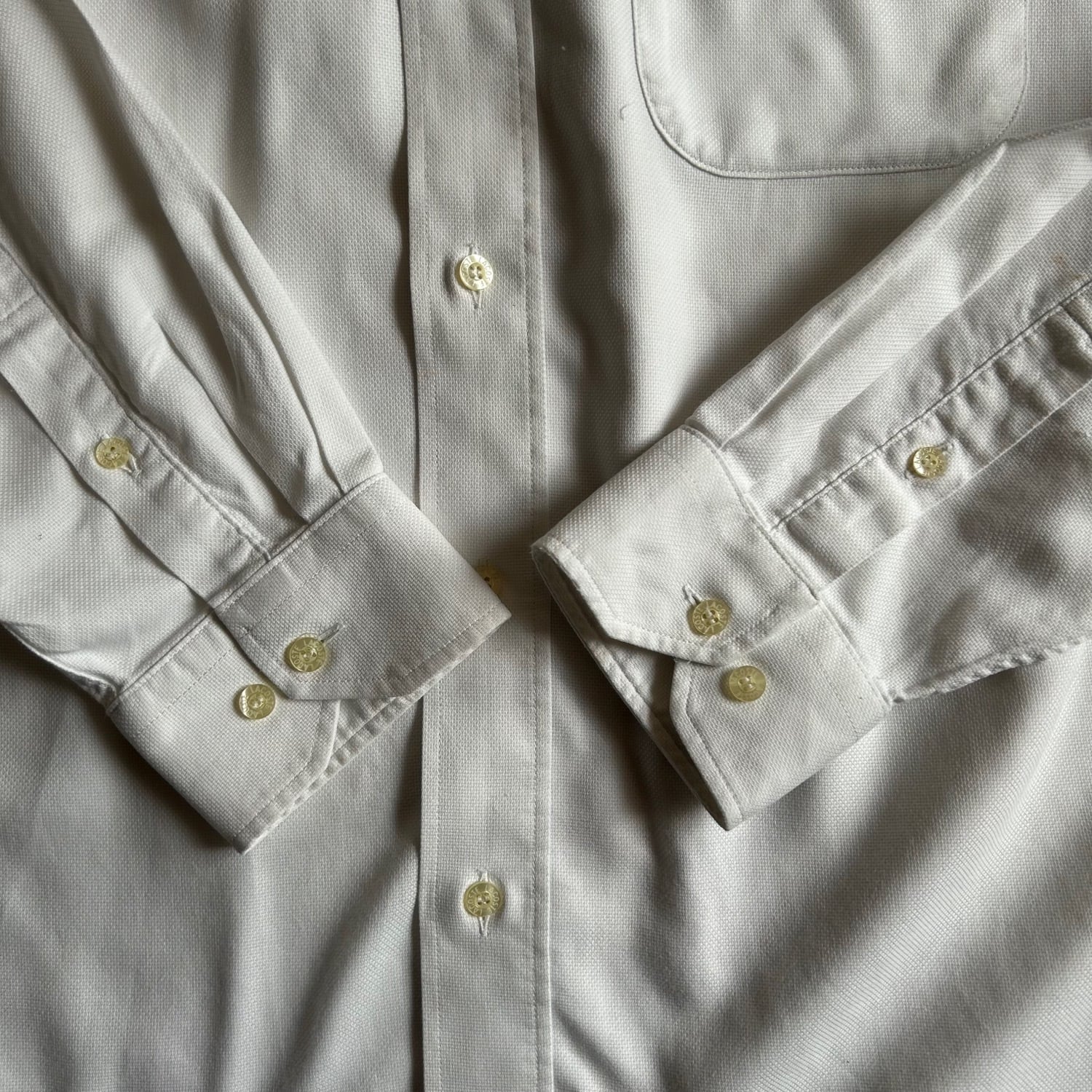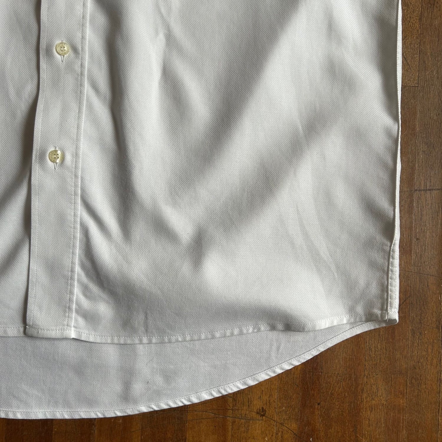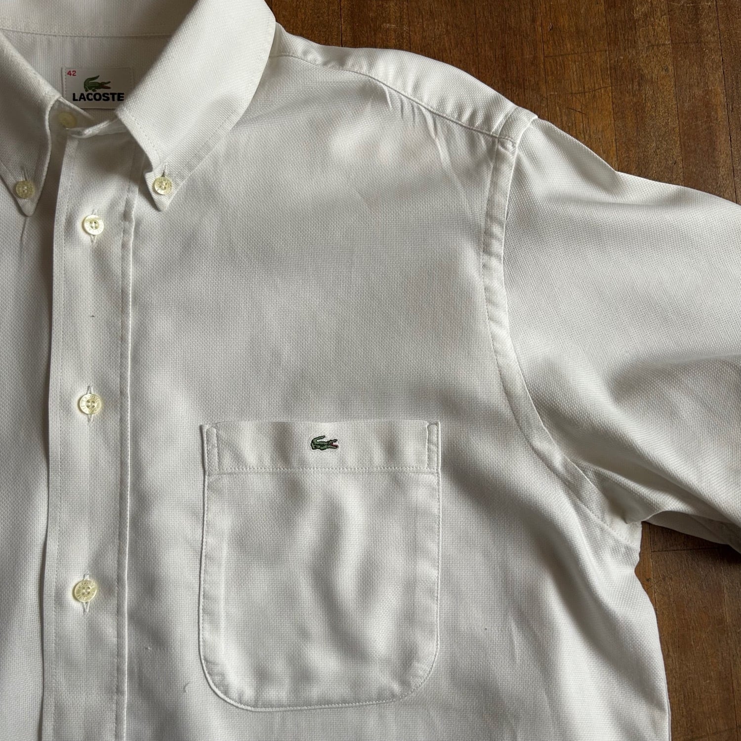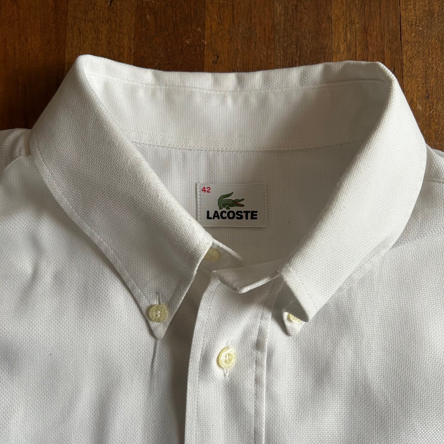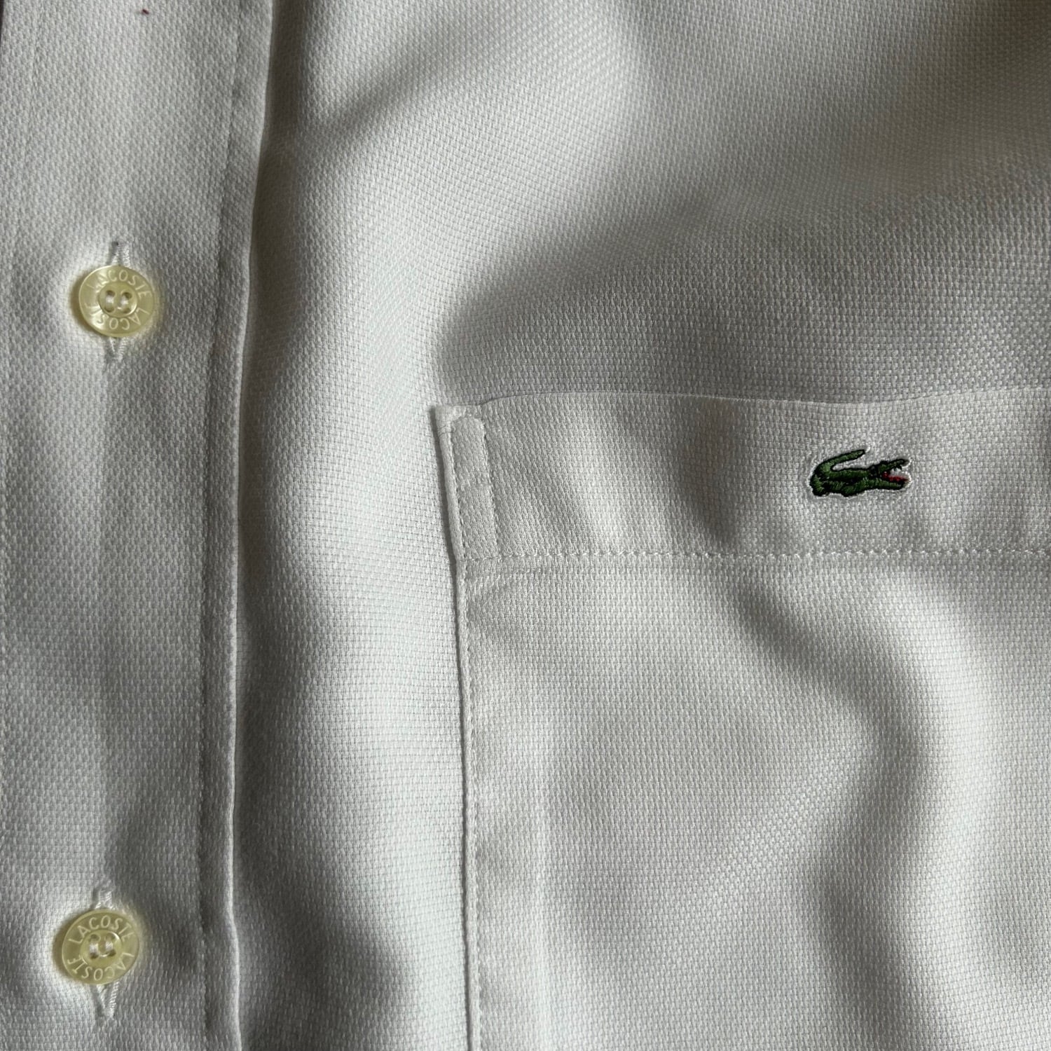 小さめな襟をボタンダウンにして貝ボタンを使用したり、裏面の見えない部分の縫製も巻き伏せ縫い(裏面も表面に見えるような仕様)が施されていて丁寧さはさすがLACOSTEです。