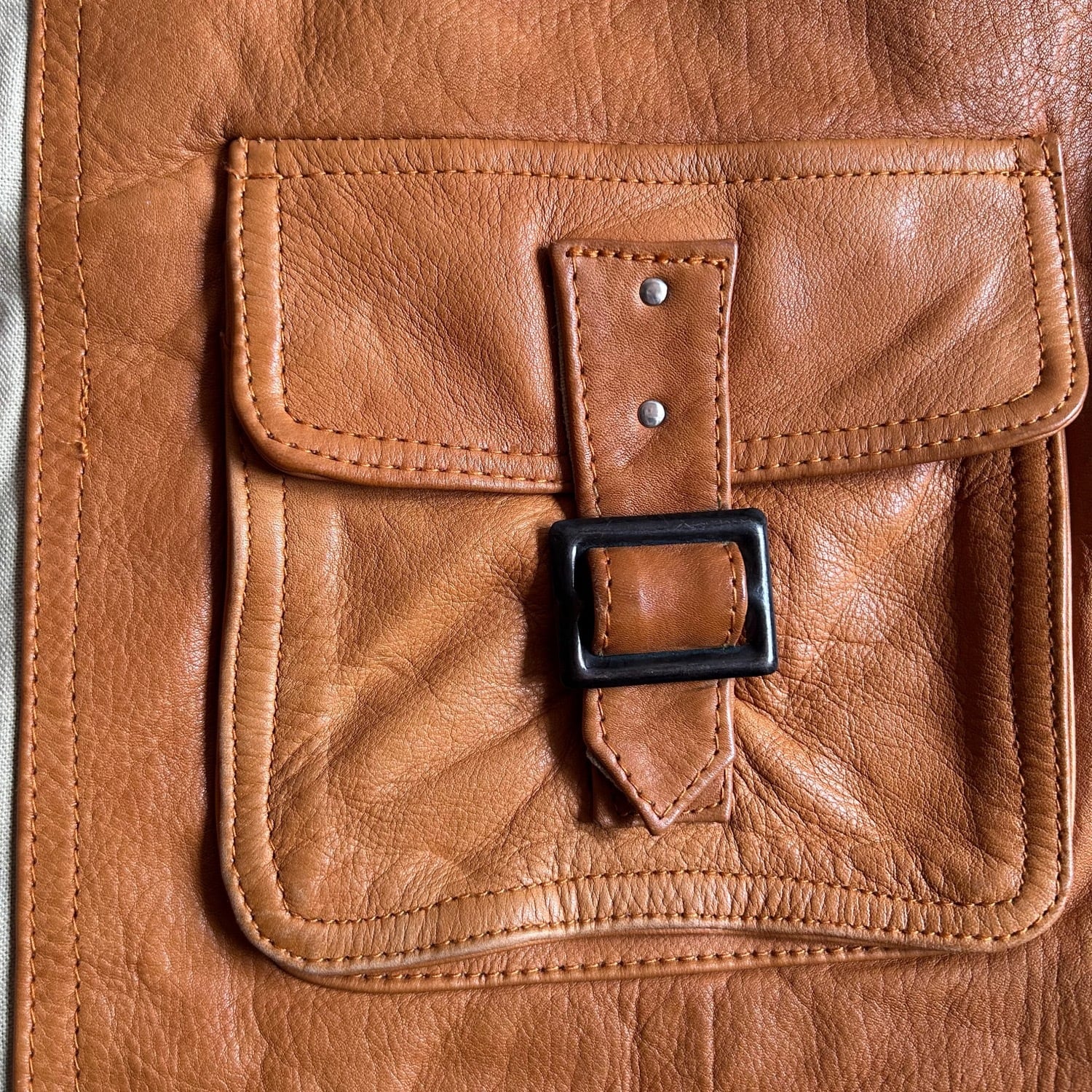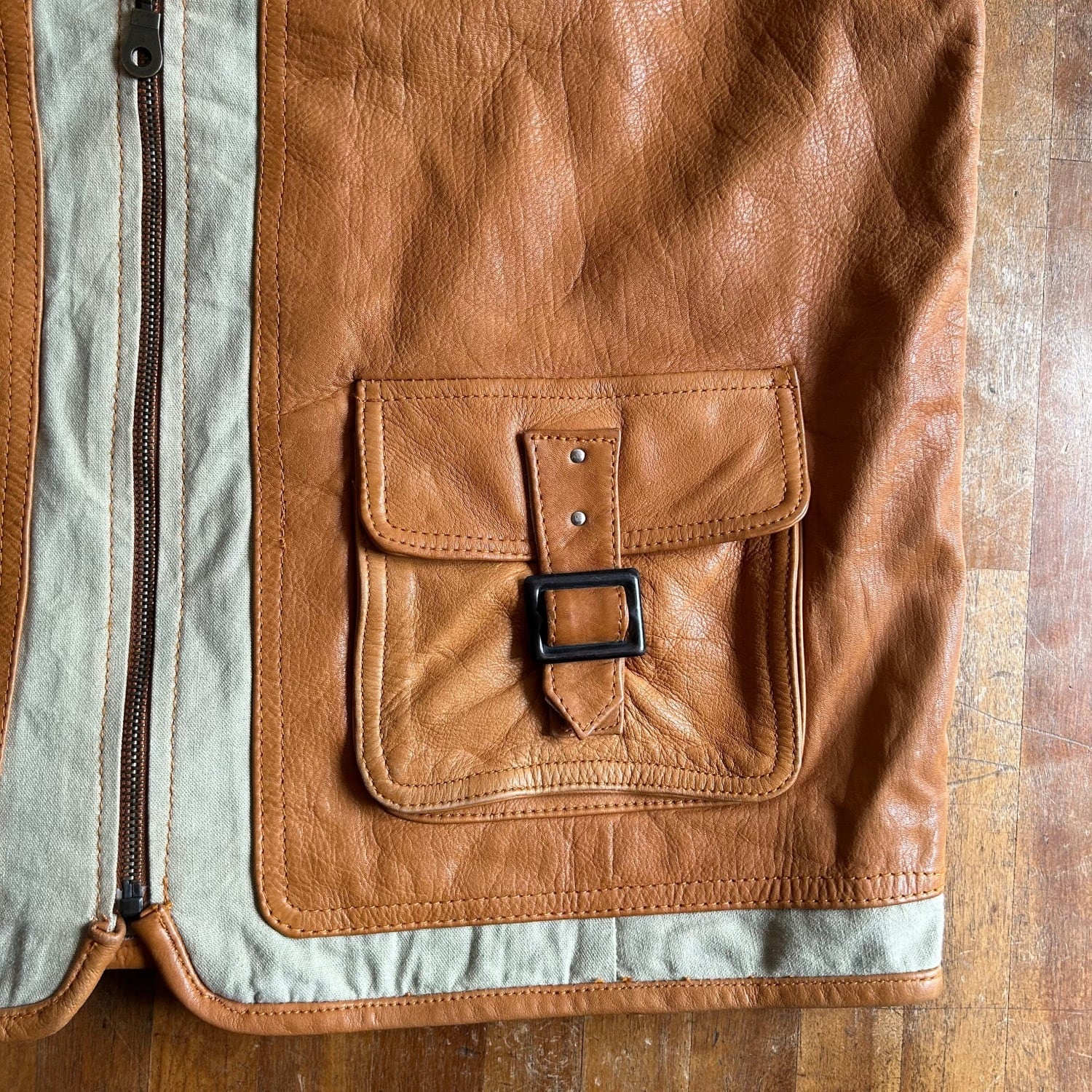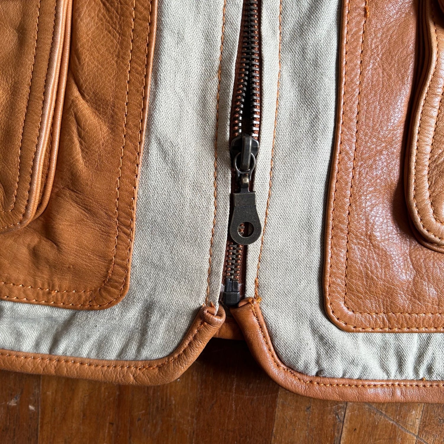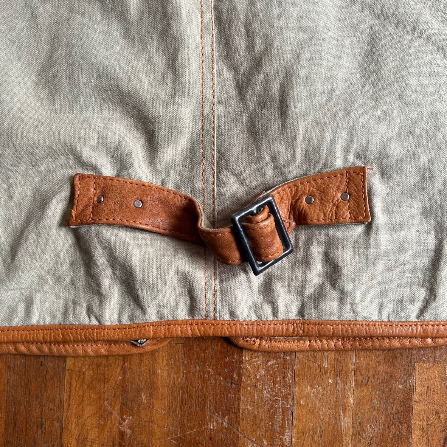 ハリのあるレザーと荒目のコットンキャンバス素材とのコンビネーション素材です。