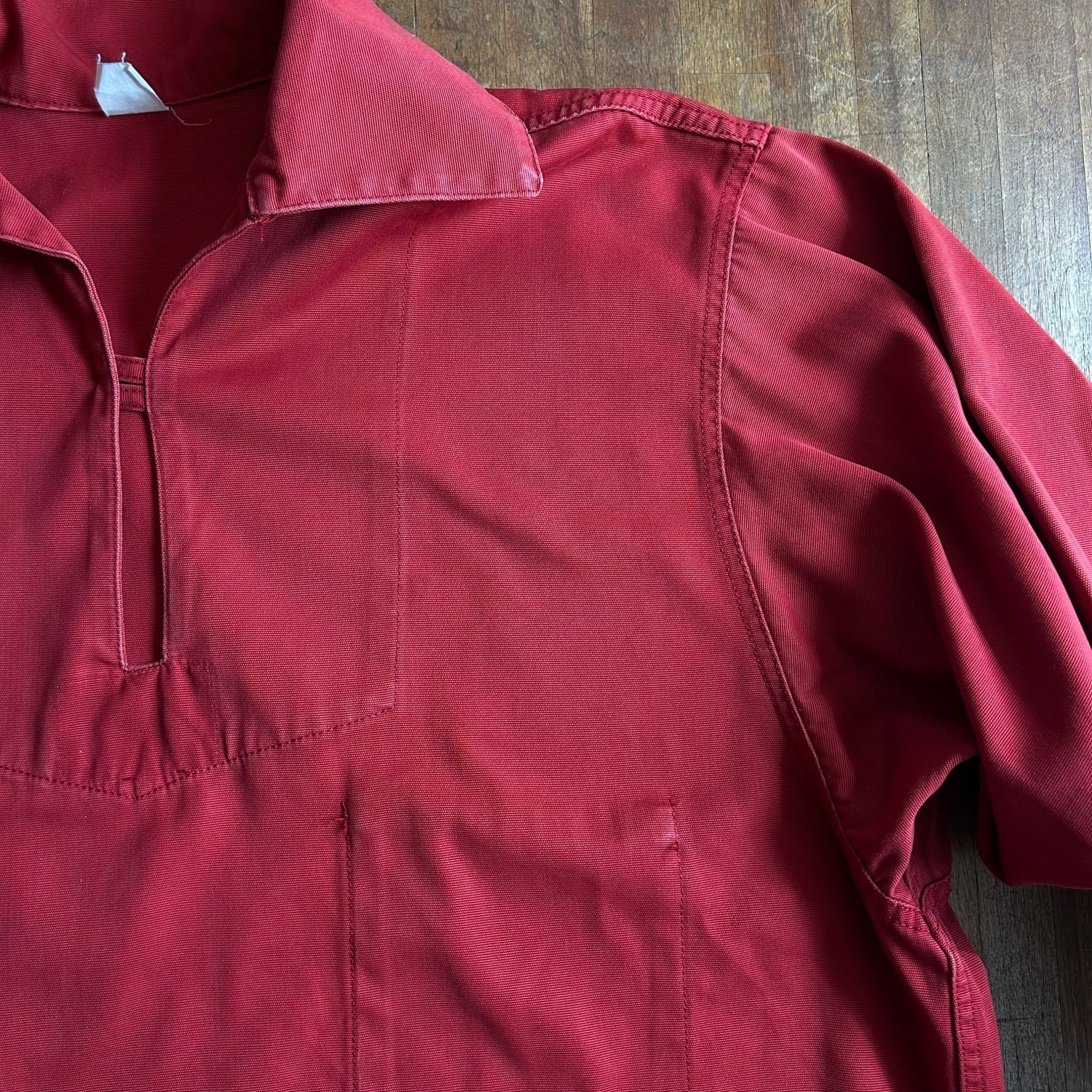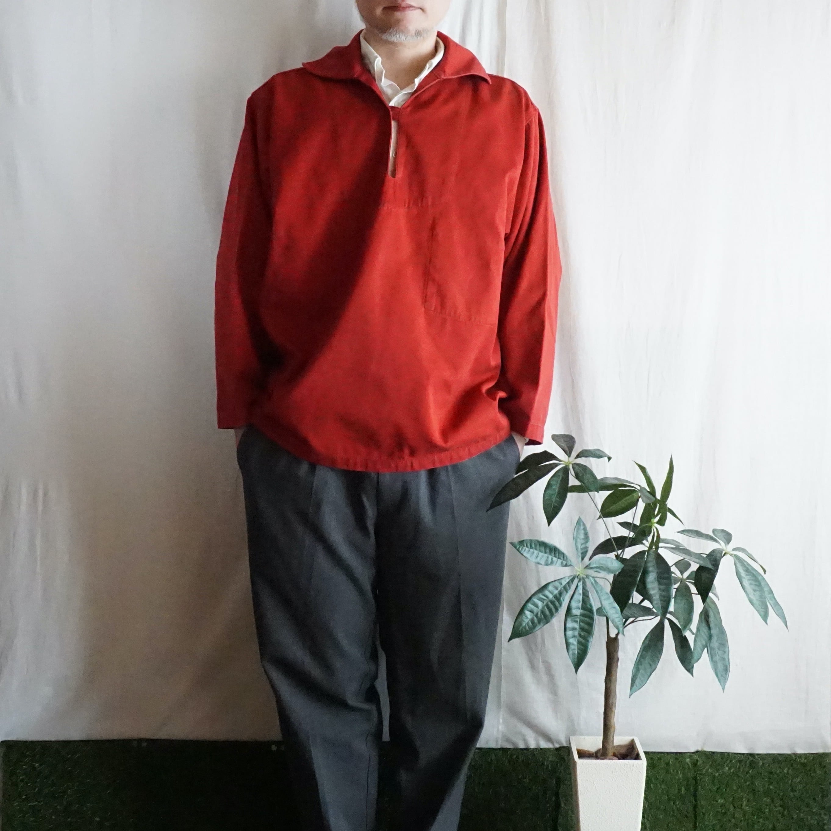 フィッシャーマンシャツの特徴は海に落ちた時に素早く胸元から割いて脱いだりできるよう工夫された意味のあるデザインです。