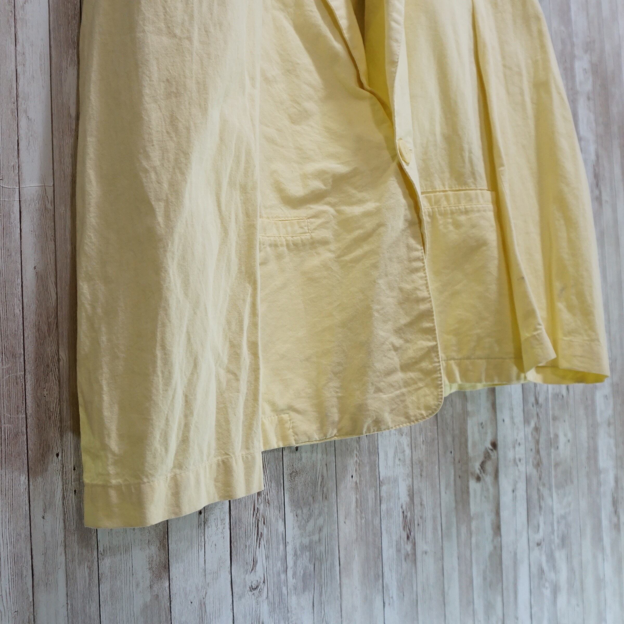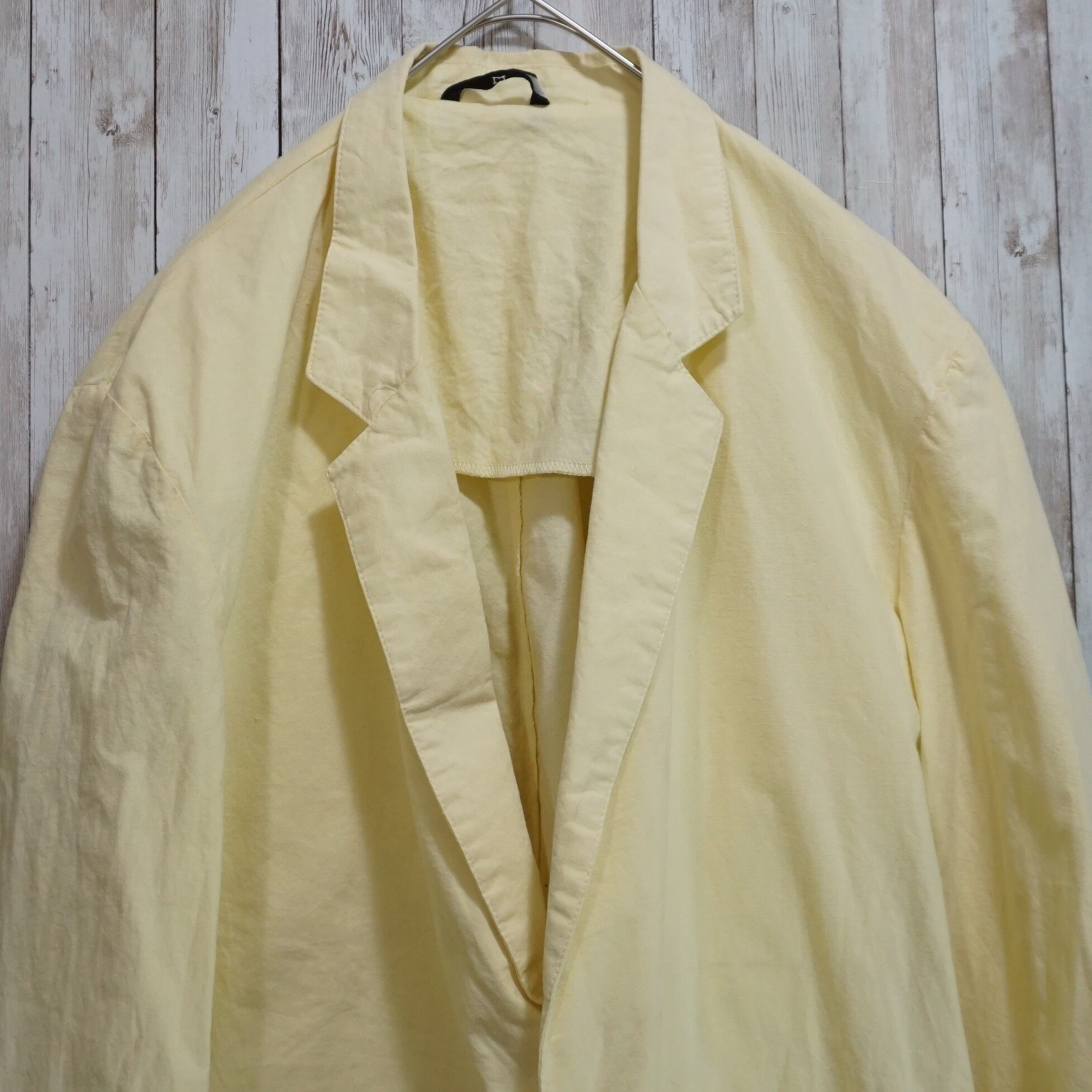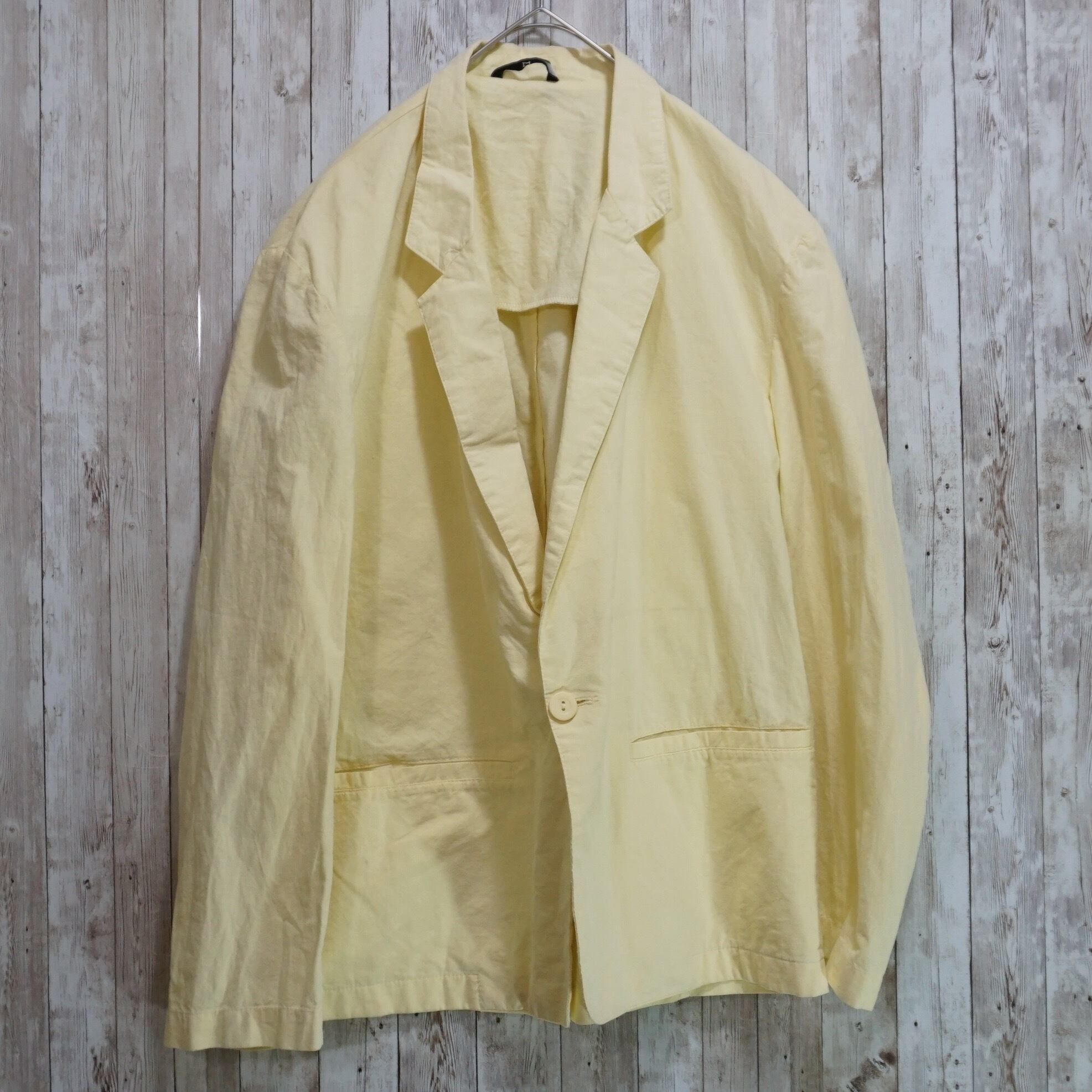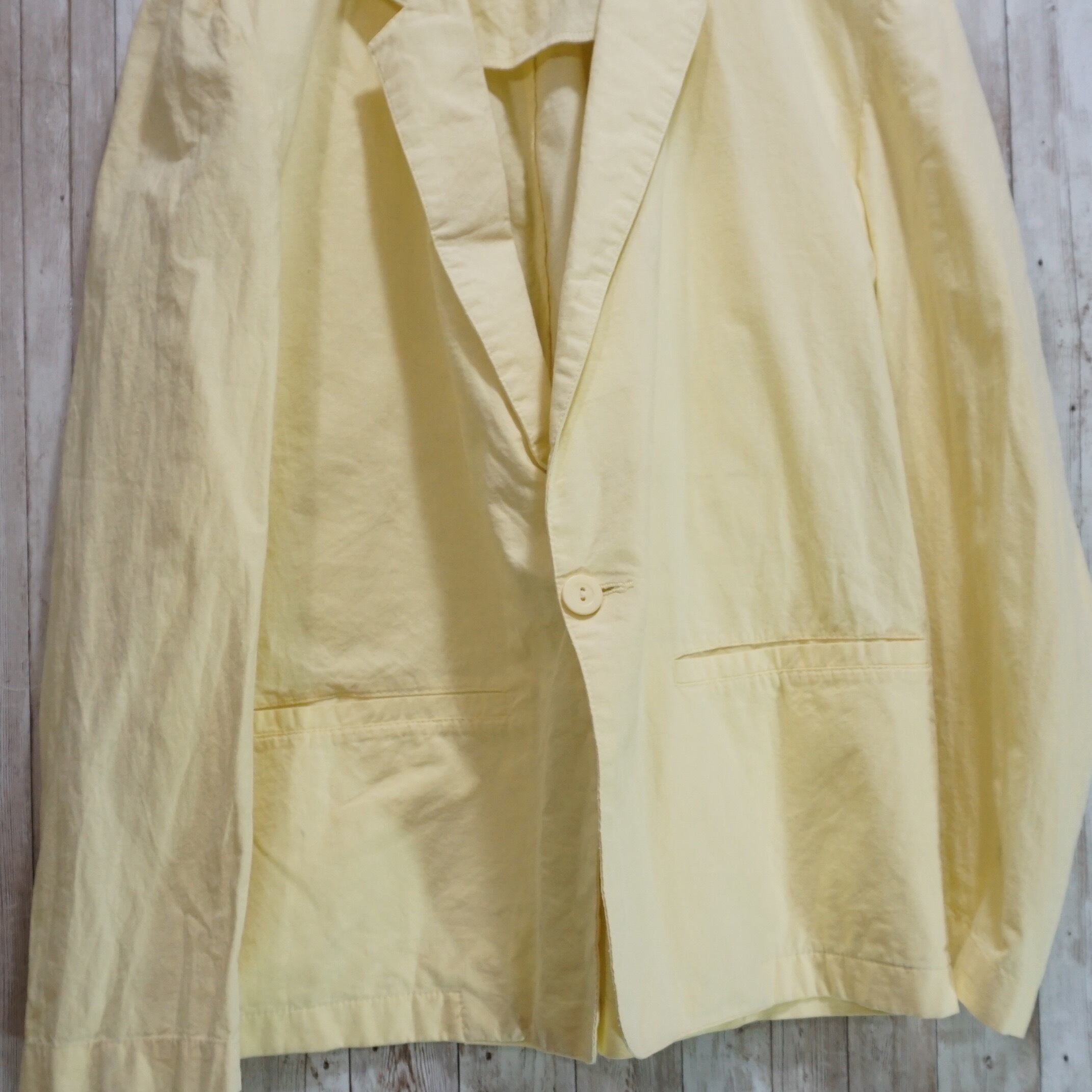 淡い色味のイエロー、ボックスシルエット、ラペル幅は細めなのにゴージラインは比較的に低めと随所にバランスを保っては崩しを確信犯で行っているデザインの跡を見ることができます。