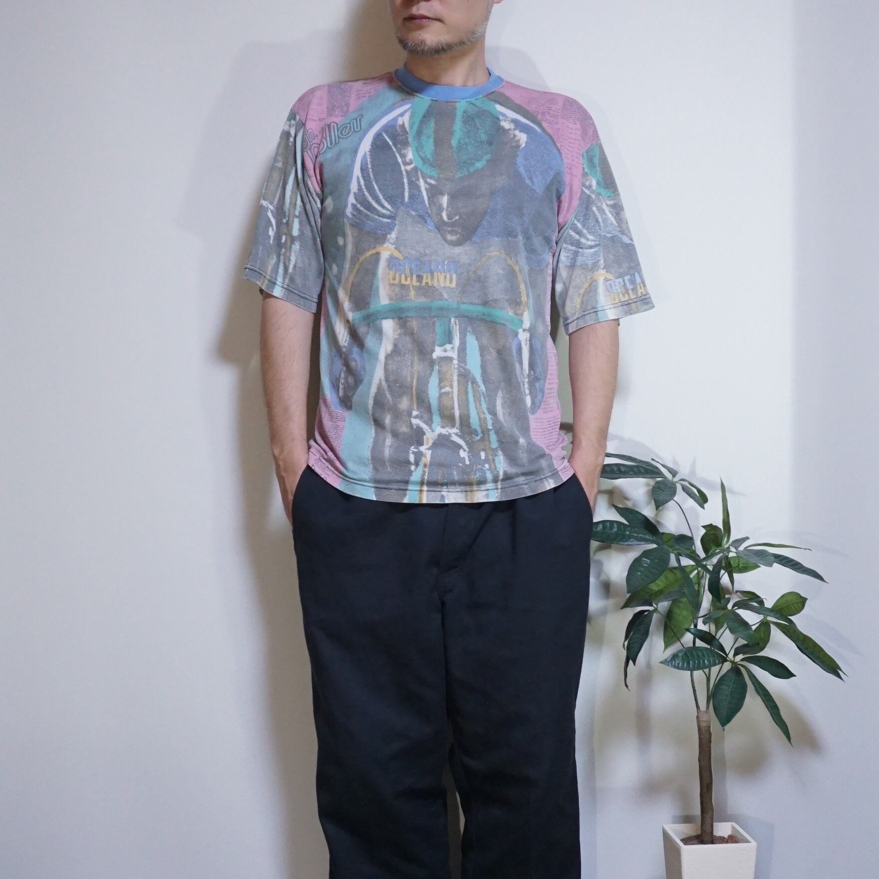 色合いはカラフルですがコットンの素材感と淡いトーンのためにきれば派手さをあまり感じません。ヨーロッパのメジャーなスポーツであるロードレースの柄というものはアメリカもののスポーツモチーフのTシャツとはまた違った魅力があります。