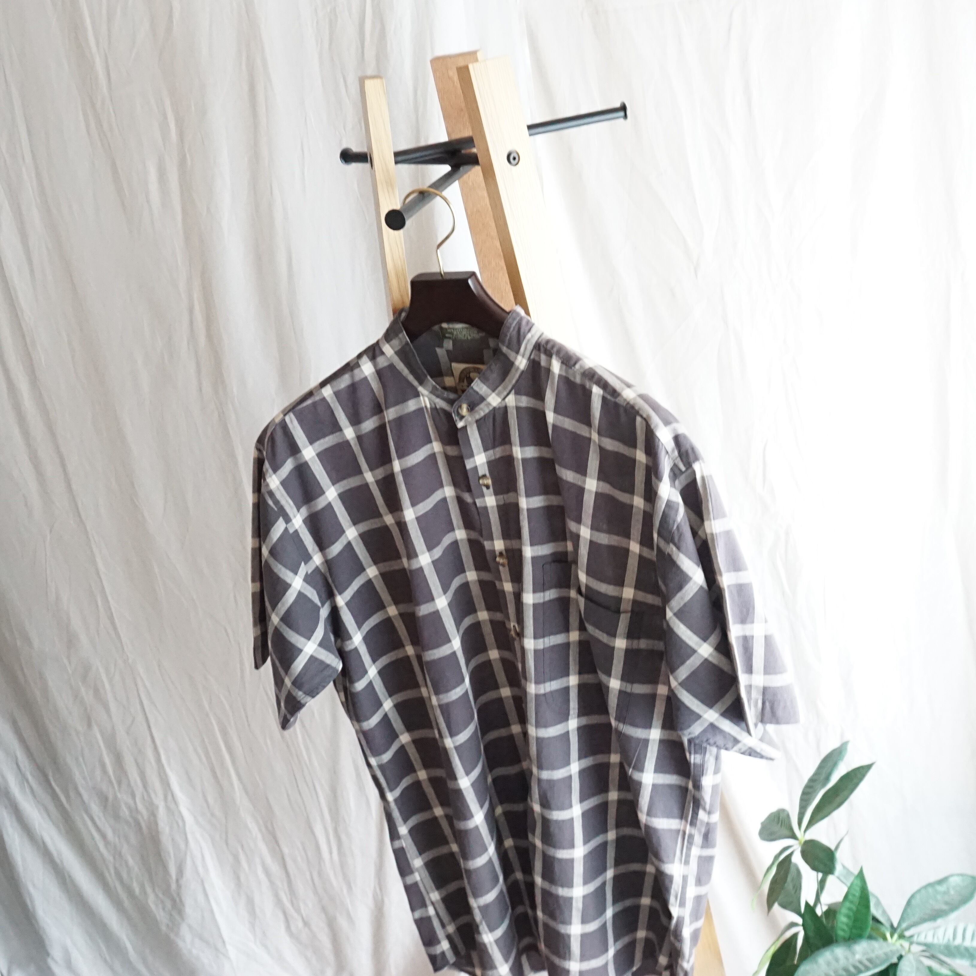 柔らかいグレーの色味の単色のチェックは品が良く、ノーカラーの襟元は力が抜けた感じでリラックスした雰囲気です。