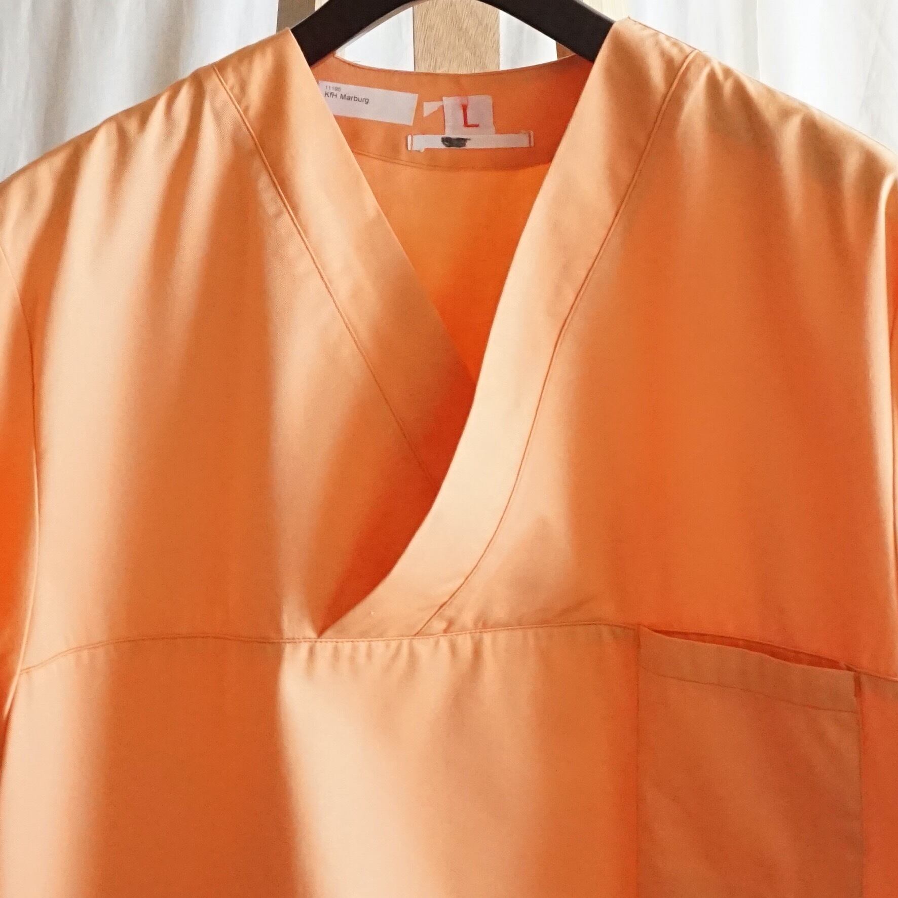 メディカルシャツ特有の合わせのネック部分にスラッシュの形の腰ポケットが個性的です。